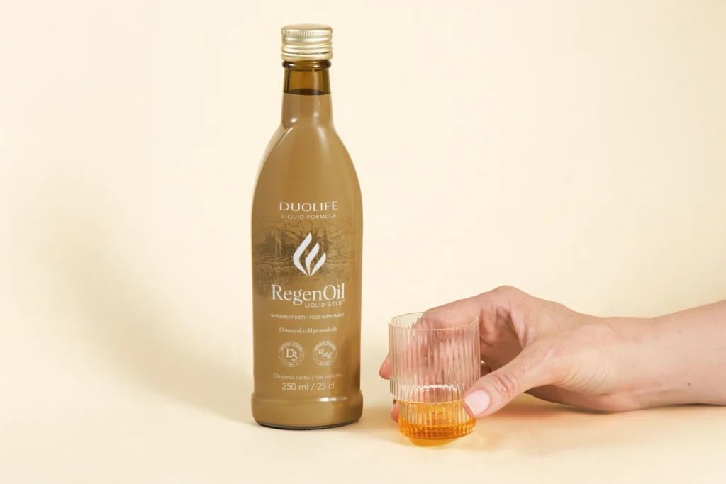 DUOLIFE RegenOil Liquid Gold® – est un complément alimentaire liquide composé d’ingrédients d’origine naturelle soigneusement sélectionnés, qui forment une composition unique conforme aux principes de synergie. Le produit DUOLIFE RegenOil Liquid Gold® est une composition de 13 huiles végétales non raffinées, pressées à froid. Il conserve une proportion optimale d’acides oméga. De plus, le produit DUOLIFE RegenOil Liquid Gold® est une source de vitamine K2 MK7 issue de l’extrait de natto, de vitamine D3 issue de lichens et de vitamine E issue d’huile de tournesol.